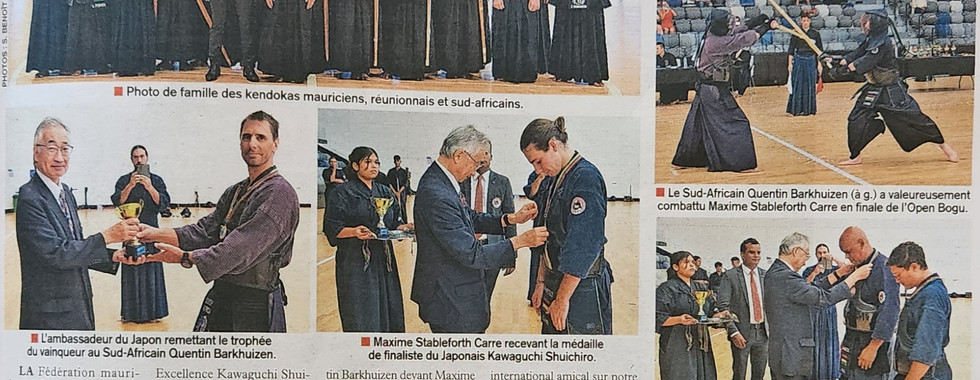 Warren HO, Cedric JACQUES sensei and RKC Dojo's oldest member, Ray FLEMING sensei (79 years young) went of a Kendo teaching expedition in Mauritius in April of 2023. Rishi BUNDHOO of KENDO FEREDATION MAURITIUS (KFM) hosted the 3 RKC Dojo members for a seminar, kyu grade examination and the 1st Ambassador's Cup competition (which was won by RKC Dojo member, Quinton BARKENHUIZEN). This was the first of its kind to help kick-start kendo in Mauritius with hopefully many more expeditions to come! A donation of refurbished shinais were also donated to the MKF later in the year. Read more about the Kendo Expedition to Mauritius here!